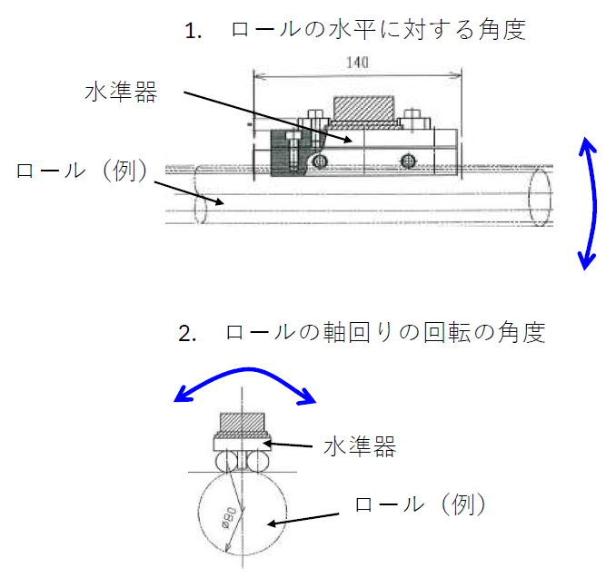 水準器を用いた場合、水準器は水平を検出するセンサであるため、ロールの水平に対する角度(1)とロールの軸回りの回転の角度(2)を計測することができます。